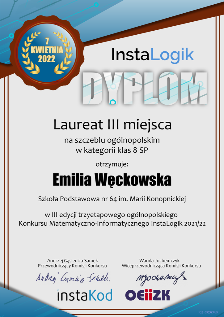 w kategorii klas 8 laureatem III miejsca została Emilia Węckowska uczennica klasy 8f.
