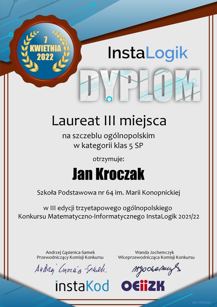 w kategorii klas 5 laureatem III miejsca został Jan Kroczak uczeń klasy 5c,