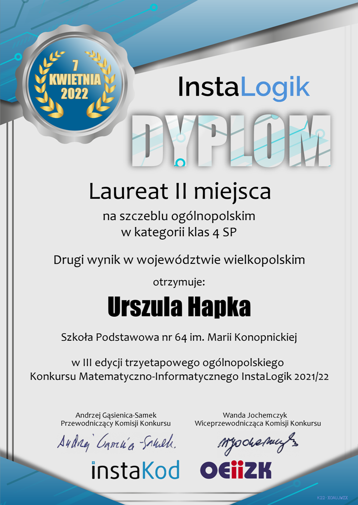 w kategorii klas 4 laureatem II miejsca została Urszula Hapka uczennica klasy 4c,