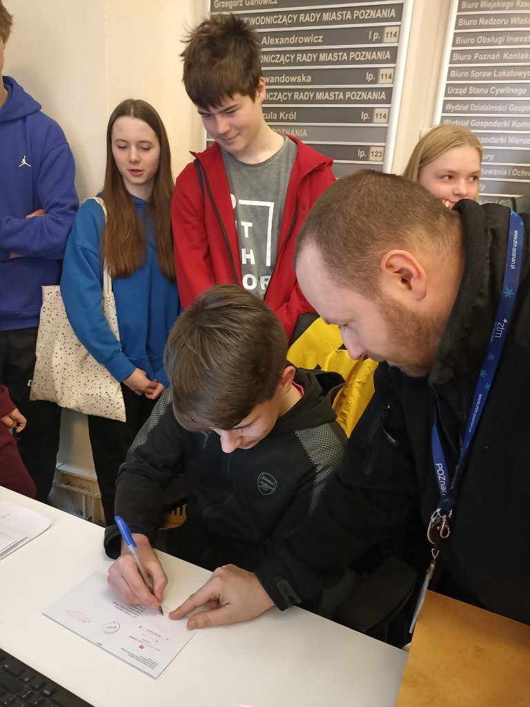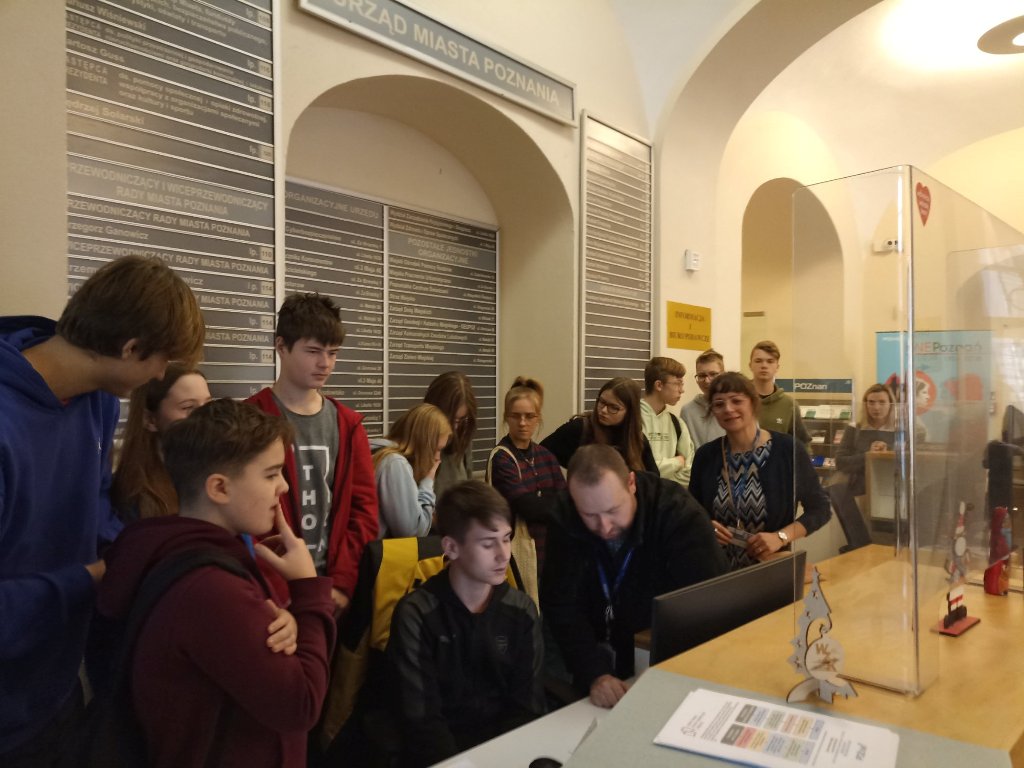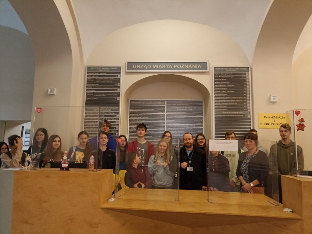 11.01. uczniowie klasy ósmej uczestniczyli w zajęciach z cyklu „WOS w praktyce”, które odbyły się w Urzędzie Miasta Poznania mieszczącego się na Placu Kolegiackim nr 17.