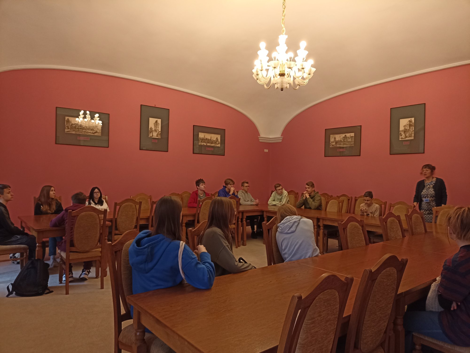 Malinowa, błękitna i biała… Młodzież zobaczyła wyjątkowe sale spotkań np. z ambasadorami, które ze względu na kolor ścian nazywają się : Malinowa, Błękitna i Biała. Uczniowie dowiedzieli się wielu ciekawostek związanych z historią zabytkowej siedziby naszego miasta.