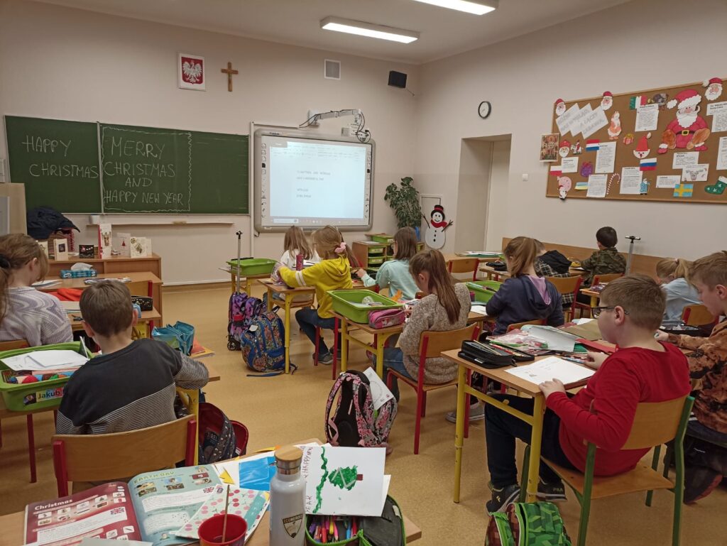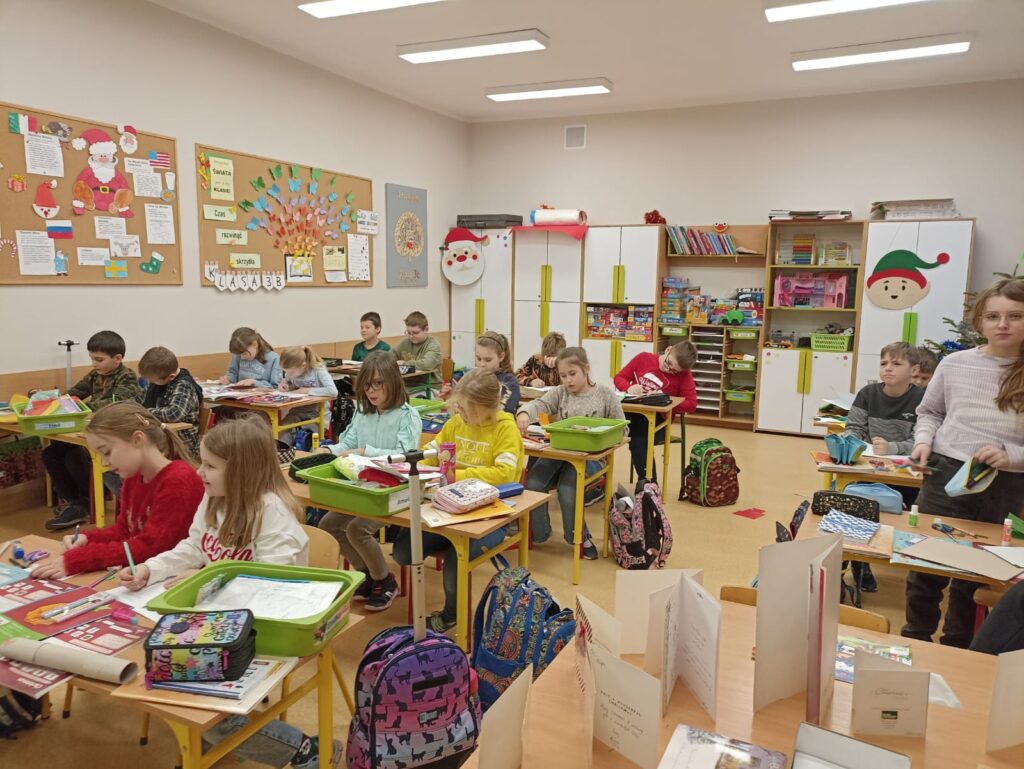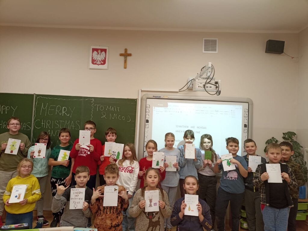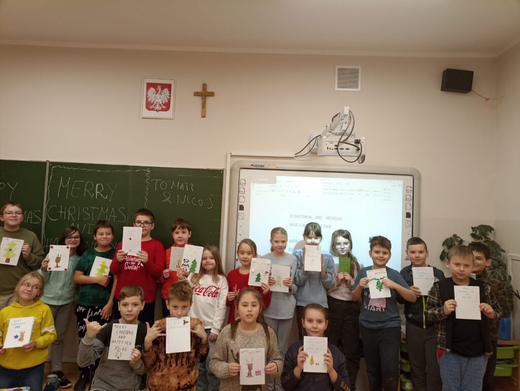 W ramach naszego międzynarodowego projektu” Let’s meet with twins „Uczniowie klas trzecich z radością tworzyli swoje kreatywne kartki świąteczne, które wysłaliśmy do naszych przyjaciół do Wielkiej Brytanii. Matthew i Nicholas z pewnością ucieszą się na widok tylu pięknych kartek z życzeniami w języku polskim i angielskim 🙂