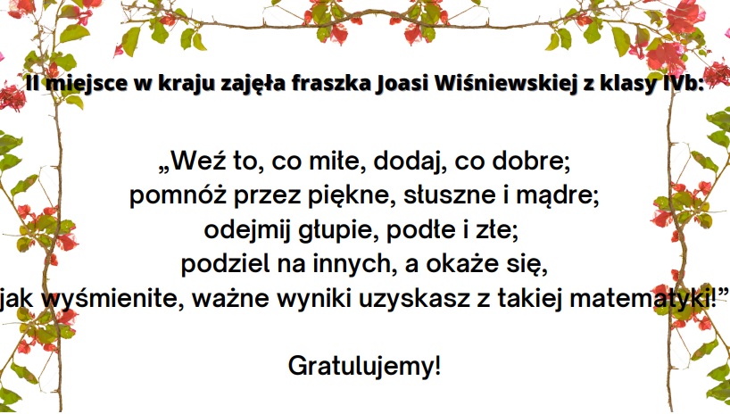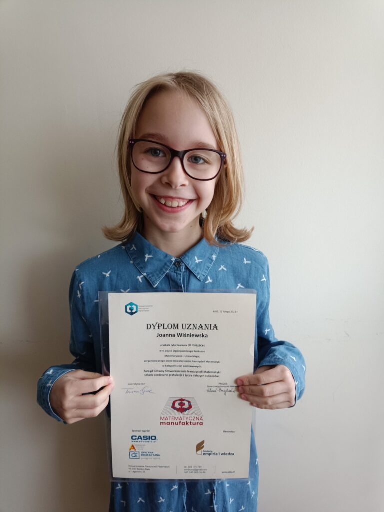 Miło nam poinformować o sukcesie naszej uczennicy. Joasia Wiśniewska z klasy 4b została Laureatką Ogólnopolskiego Konkursu matematyczno-literackiego pt. „Matematyka fraszką, wierszem i limerykiem”.